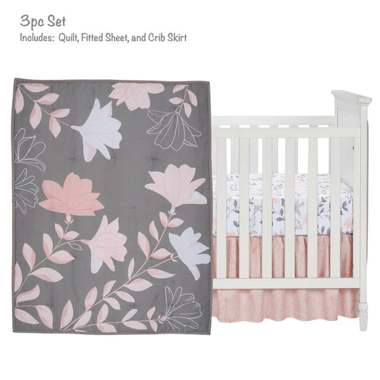 Petals Gray/Pink Sateen Cotton Floral 3-Piece Baby Crib Bedding Set