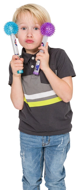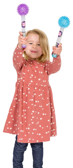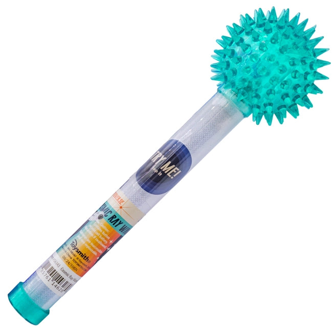 Tap this popular Cosmic Ray Light-Up Wand toy from Toysmith, and it flashes with a 15-second multi-colored light show. Wands have a squeezable soft rubber spiky top and come in 4 assorted colors. Available in turquoise, orange, blue, and purple. For in-store attention, wands fit within a space themed display case that features a multi-colored light flash from a Cosmic Ray Wand toy. Display case captures attention to make this an easy impulse buy or party favor choice. Each wand includes non-replaceable batteries.