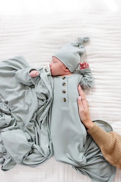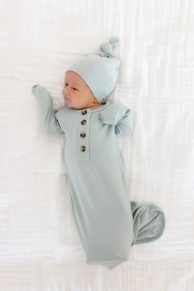 The easiest tie-bottom outfit for day or night. Made for hassle free diaper changes and gentle dressing, I designed this with a button-down front and tie bottom for simple closure (no more snaps at 2am!). Fold over wrist cuffs are the most thoughtful finishing touch.