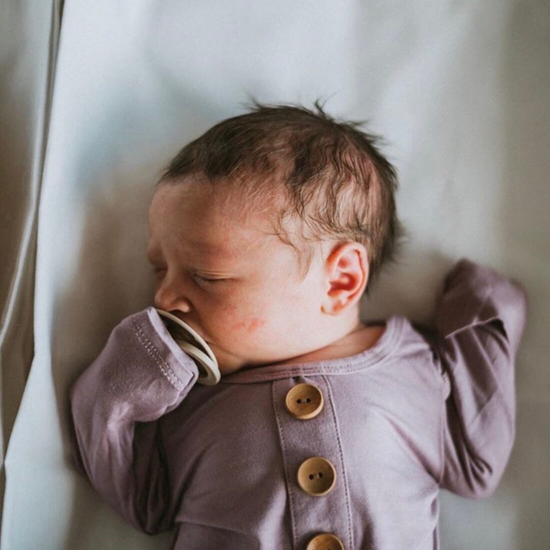 Wrapped in love from head to toe! Our Dusty Purple Knot Gown is the coziest little cuddle for your newborn, featuring a soft dusty purple that every little girl will love. Made from ultra-soft fabric that’s gentle on delicate newborn skin, this gown is designed to keep baby comfy all day and night. The self-tying knot makes diaper changes a breeze—just untie, change, and retie without any snaps or zippers to fuss with. With fold-over mittens to protect your baby from scratches and a stretchy neckline for easy dressing, this gown will quickly become a mom-favorite. Whether it’s for naptime, snuggles, or those first precious photos, this is the outfit you’ll reach for again and again.