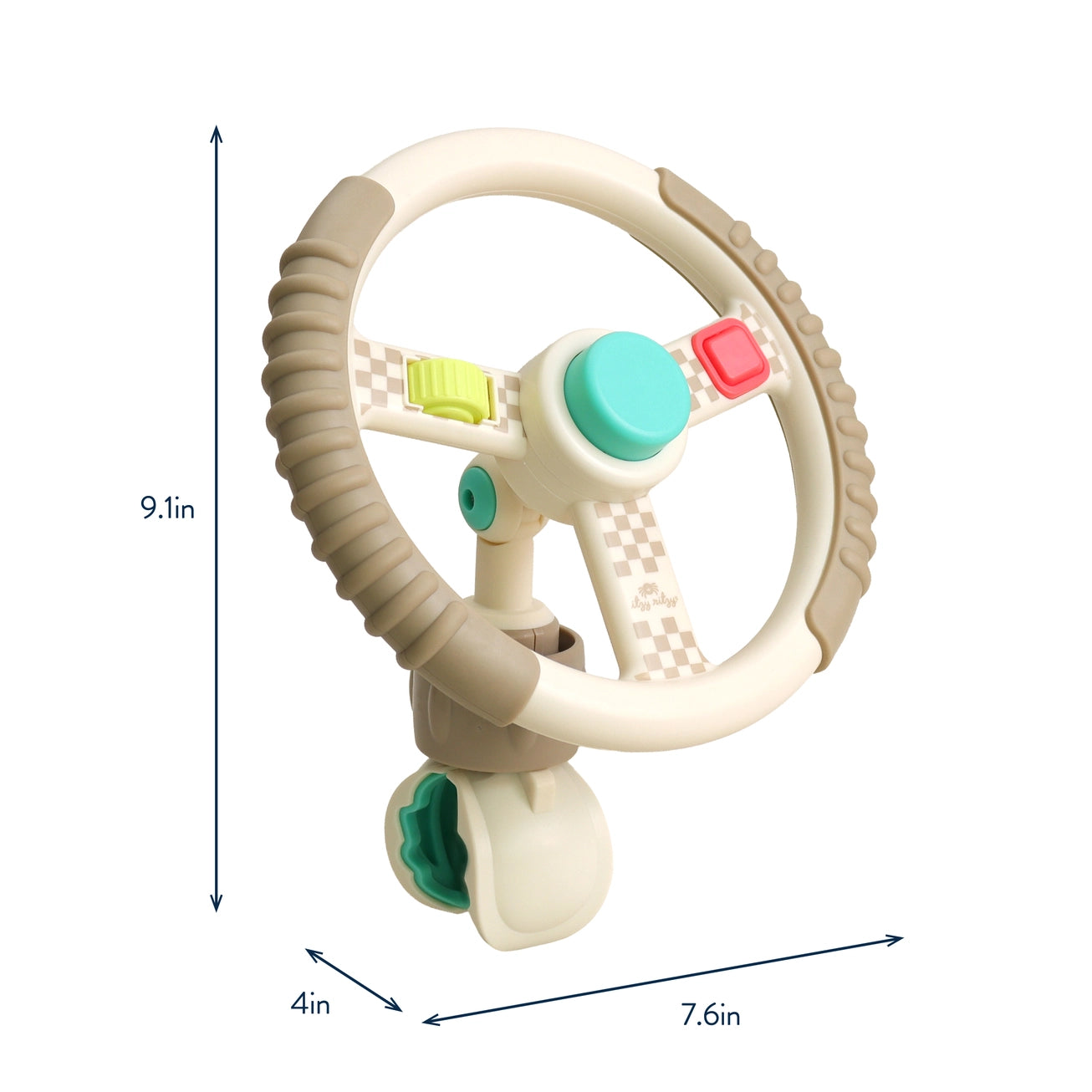 Put Baby in the Driver’s Seat! Buckle up for fun on the run with the Bitzy Driver! This easy-grip steering wheel clamps to most wagons, strollers, and shopping carts, turning everyday outings into mini adventures. Three built-in fidgets keep little hands busy while they steer!