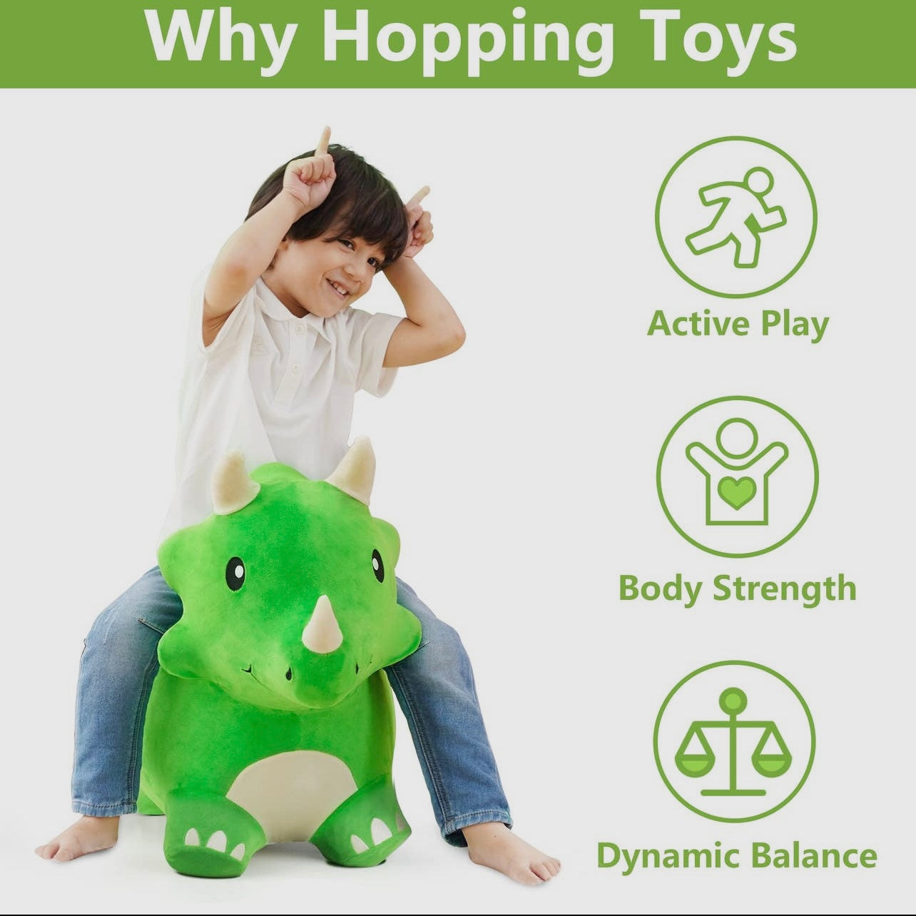 This hopping horse outside features a soft plush cover and the inside is eco-friendly rubber. Happy Triceratops Dinosaur want give you a safe and pleasant play.