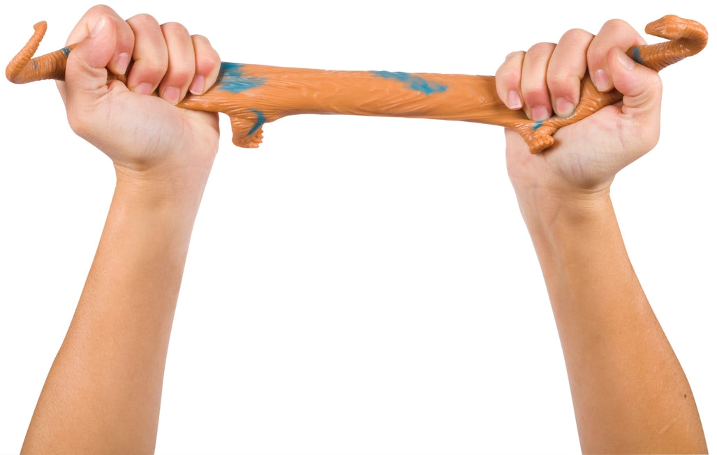 A must have for young dinosaur lovers, Toysmith’s super squishy and ultra-stretchy Dinosaur Squishimals range in size from 5–8 inches before stretching, and come in a variety of colors and dinosaur types. Each dino squish-and-stretch toy is filled with beads and features a soft, pliable skin for sensory satisfaction. Dinosaurs can be pulled with both hands for ultra-stretchy fun and will always return to their original shape. From keeping kids entertained at home or on the go, toss them in a purse, backpack or carry-on bag, they’re perfect for learning shapes, colors, and different dinosaur names. These toys are both fun and educational. A rainforest themed Dinosaur Squishimals display case holds an assortment of brightly colored dinosaurs.