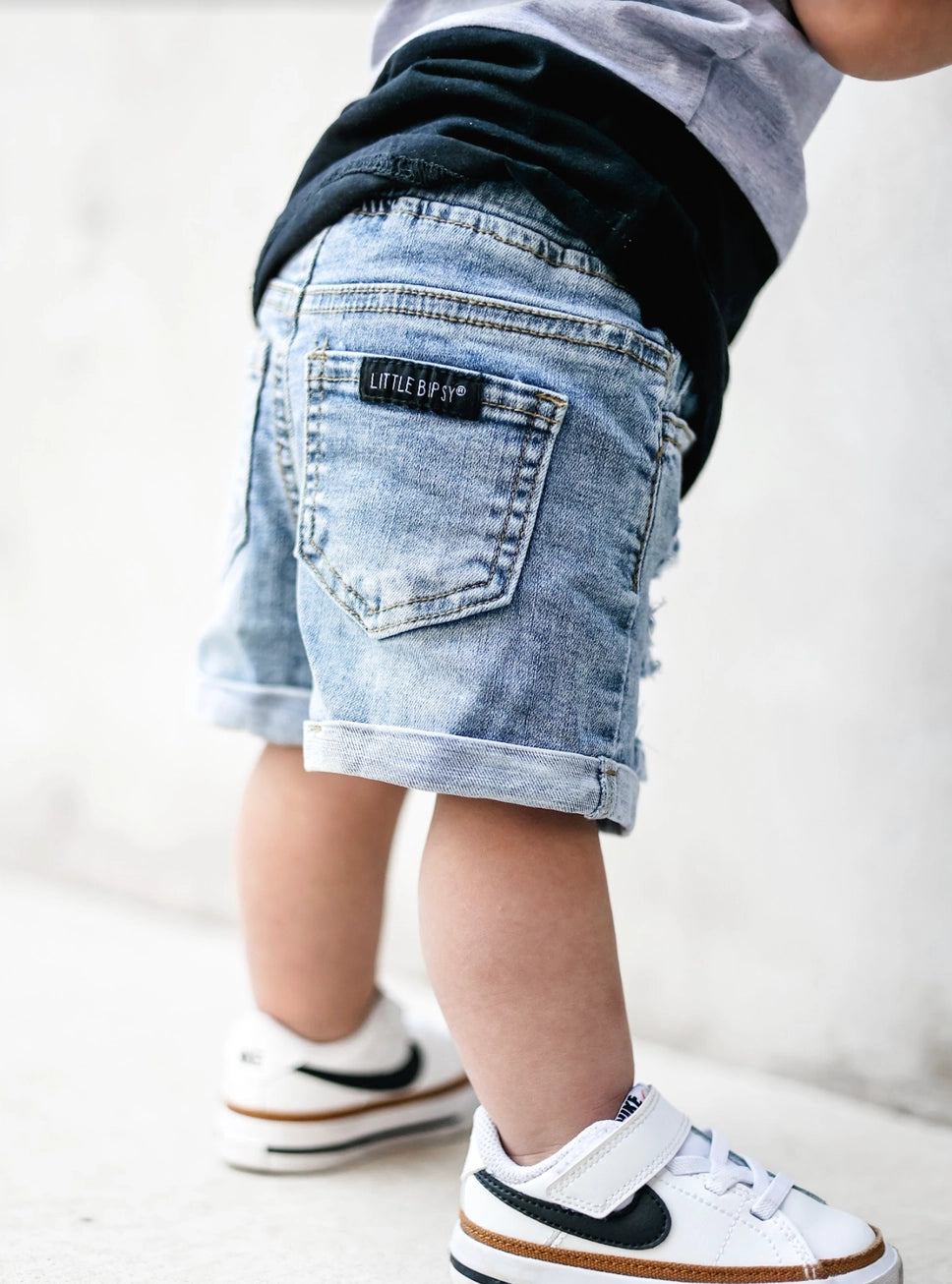 Meet your new favorite denim shorts. Our Distressed Denim Shorts make any outfit look effortlessly cool. These shorts were designed with an elastic waistband + functioning drawstring for easy dressing, as well as trendy distressing + rolled leg cuffs for chill warm-weather style.