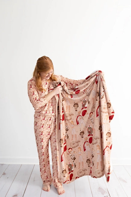 Throw blankets measure 50x60 inches and are printed on one side, with a white back.