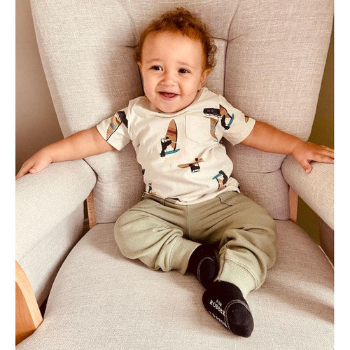 Parents love our socks because they stay on in all kinds of play. An elastic gather at the ankle ensures that our socks stay on while a skid resistant application on the soles helps prevent slips and falls. Once you try our socks, you and your baby will love them as well