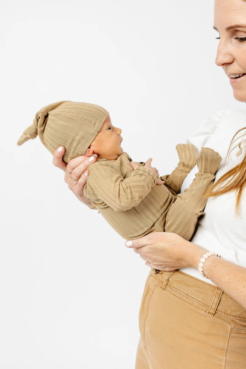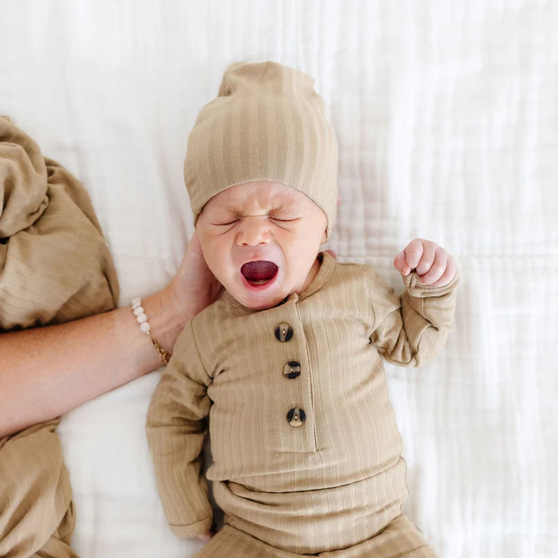 The easiest tie-bottom outfit for day or night. Made for hassle free diaper changes and gentle dressing, I designed this with a button-down front and tie bottom for simple closure (no more snaps at 2am!). Fold over wrist cuffs are the most thoughtful finishing touch.