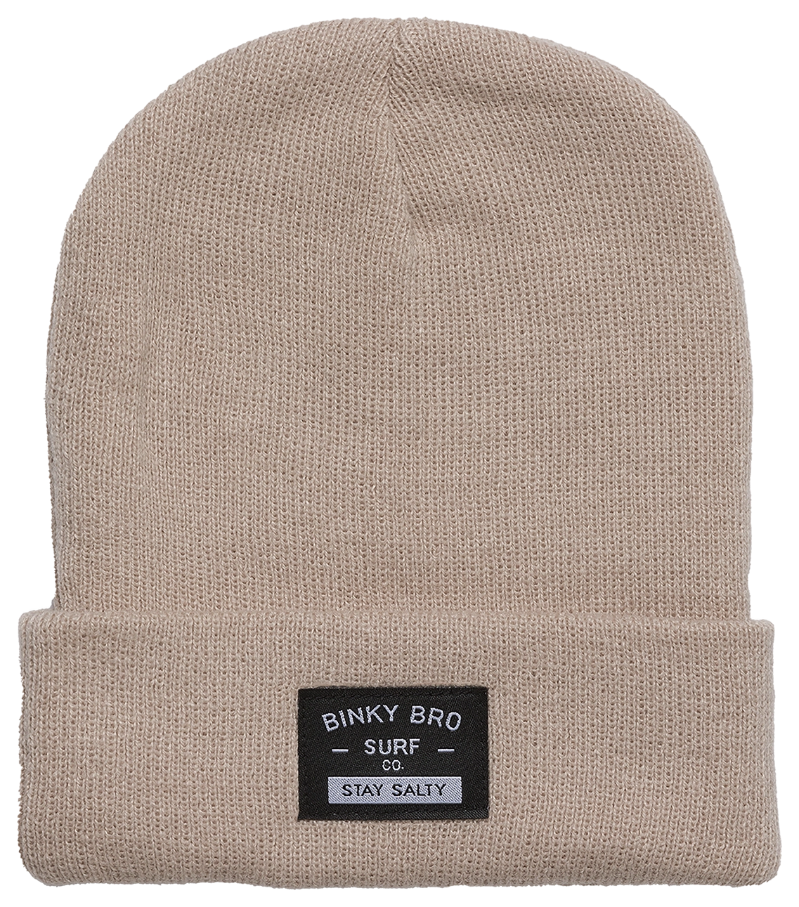 Our Beige Jackson Hole beanie is 100% acrylic. It has a "BinkyBro Surf Co" embroidered patch on the front.