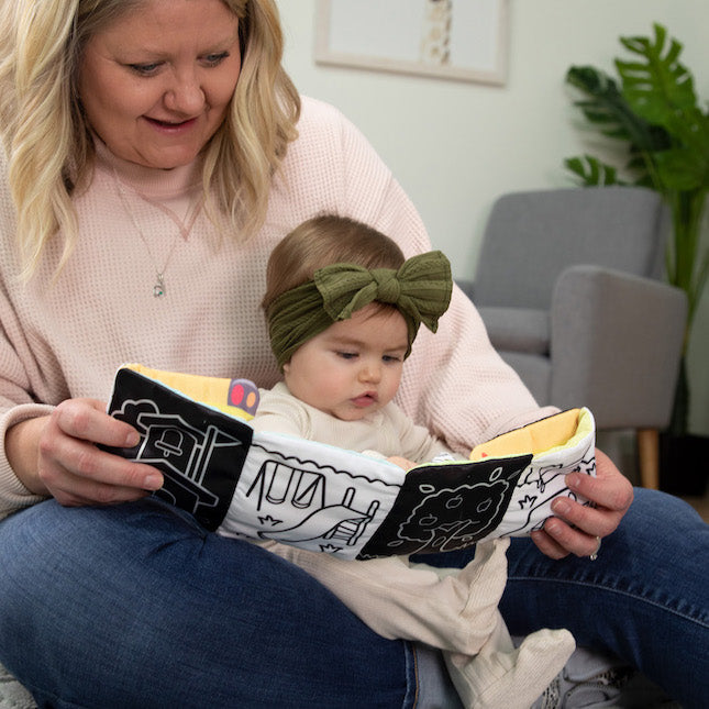 This adorable fabric bus unfolds to reveal bright colors, friendly faces in every window, plus a mirror hidden under a crinkle flap.