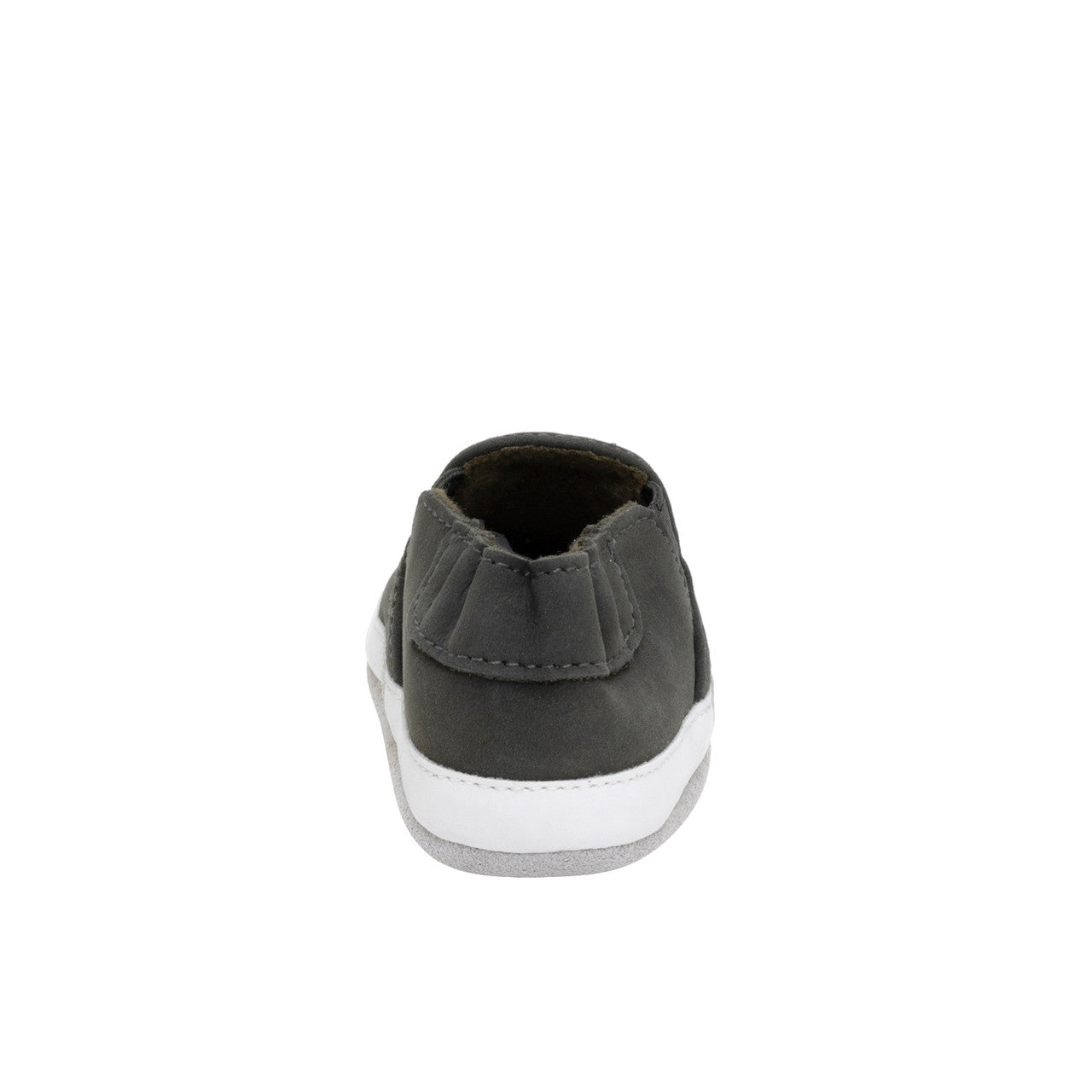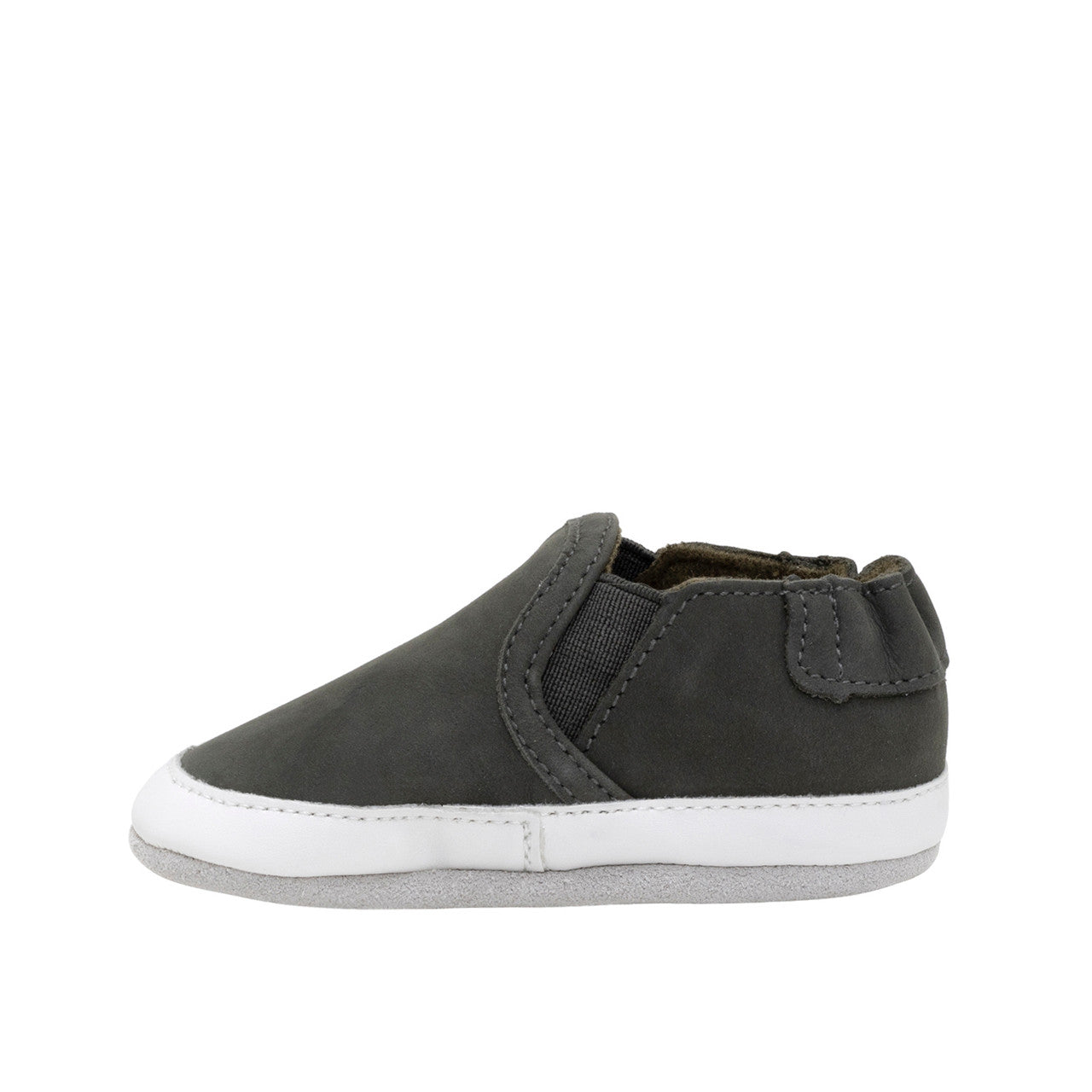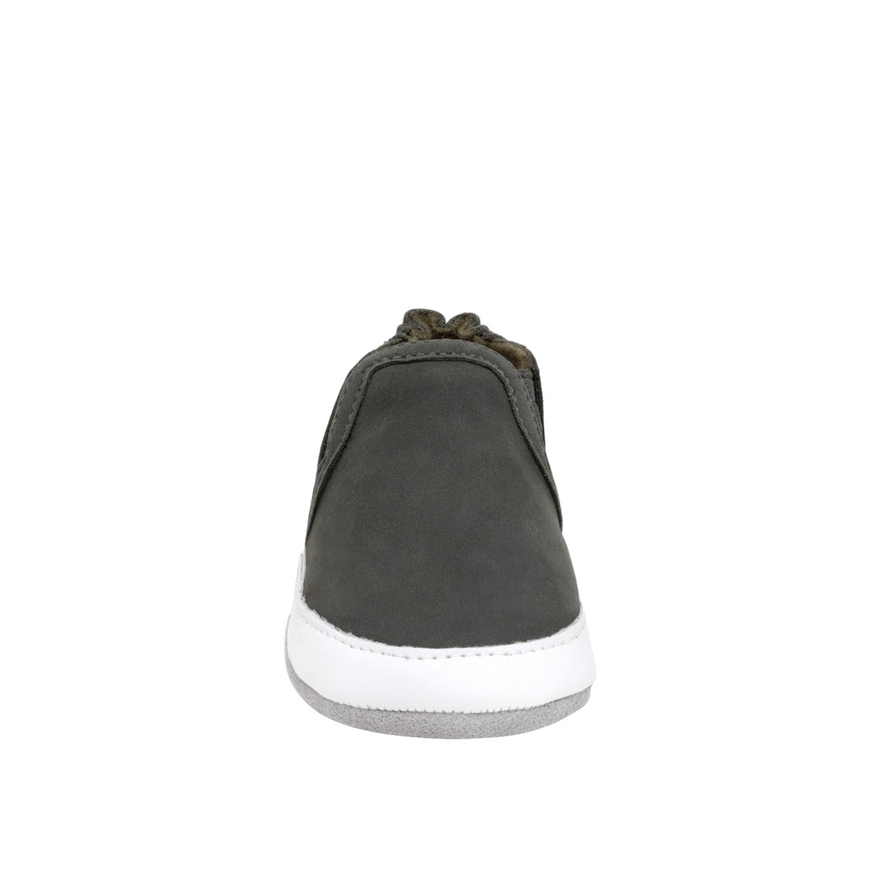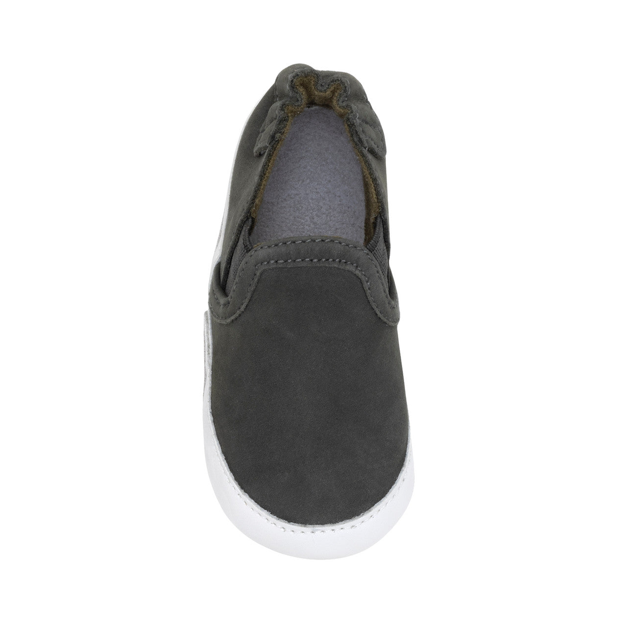 The elasticized accents on the sides and heel of these baby boy slip-on shoes make for an easy, snug fit that stays on without constricting, and the slip-resistant, suede sole helps little feet grip the floor as they learn to balance and walk. An easy-to-clean charcoal grey color ensures these little kicks will hide spills, dirt, and other typical baby messes. Keep your kid cozy while promoting healthy foot development with these baby boy slip-on shoes!