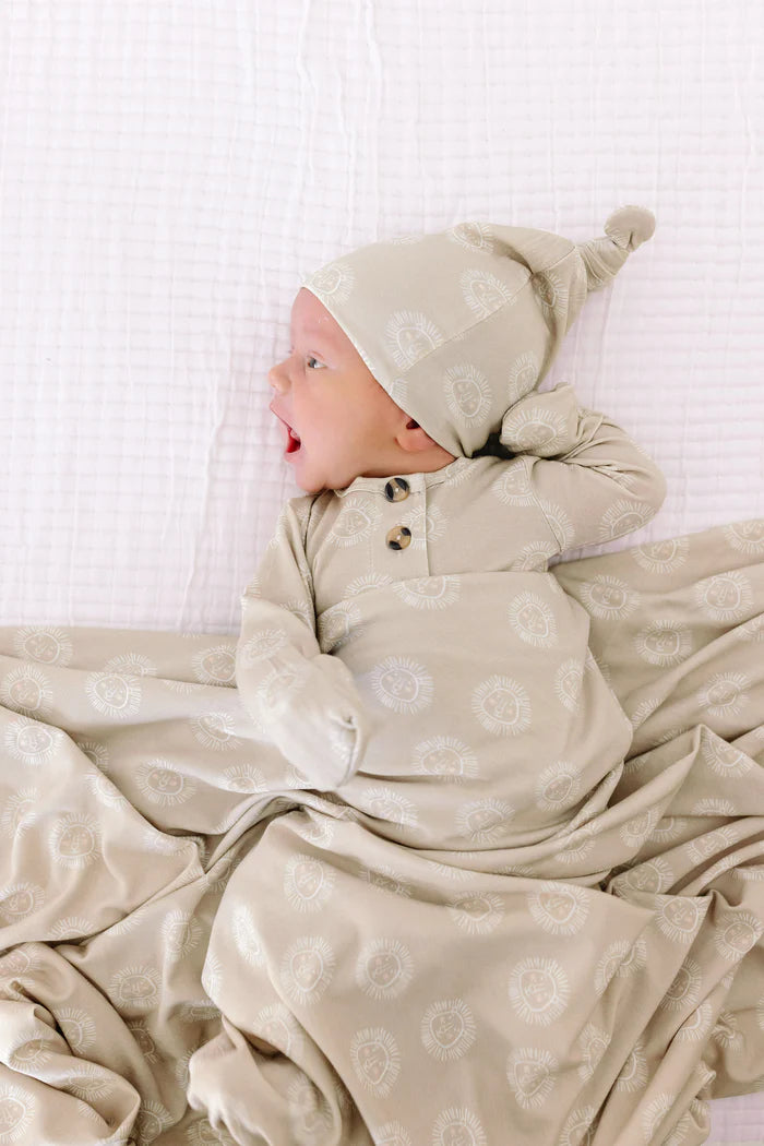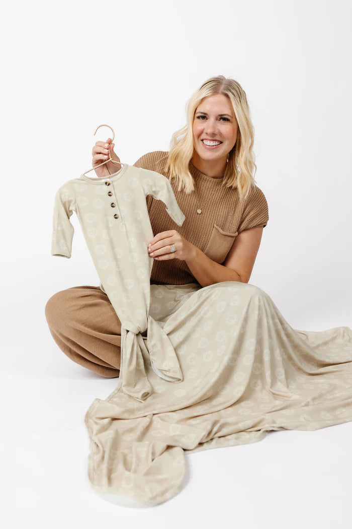 The easiest tie-bottom outfit for day or night. Made for hassle free diaper changes and gentle dressing, I designed this with a button-down front and tie bottom for simple closure (no more snaps at 2am!). Fold over wrist cuffs are the most thoughtful finishing touch.