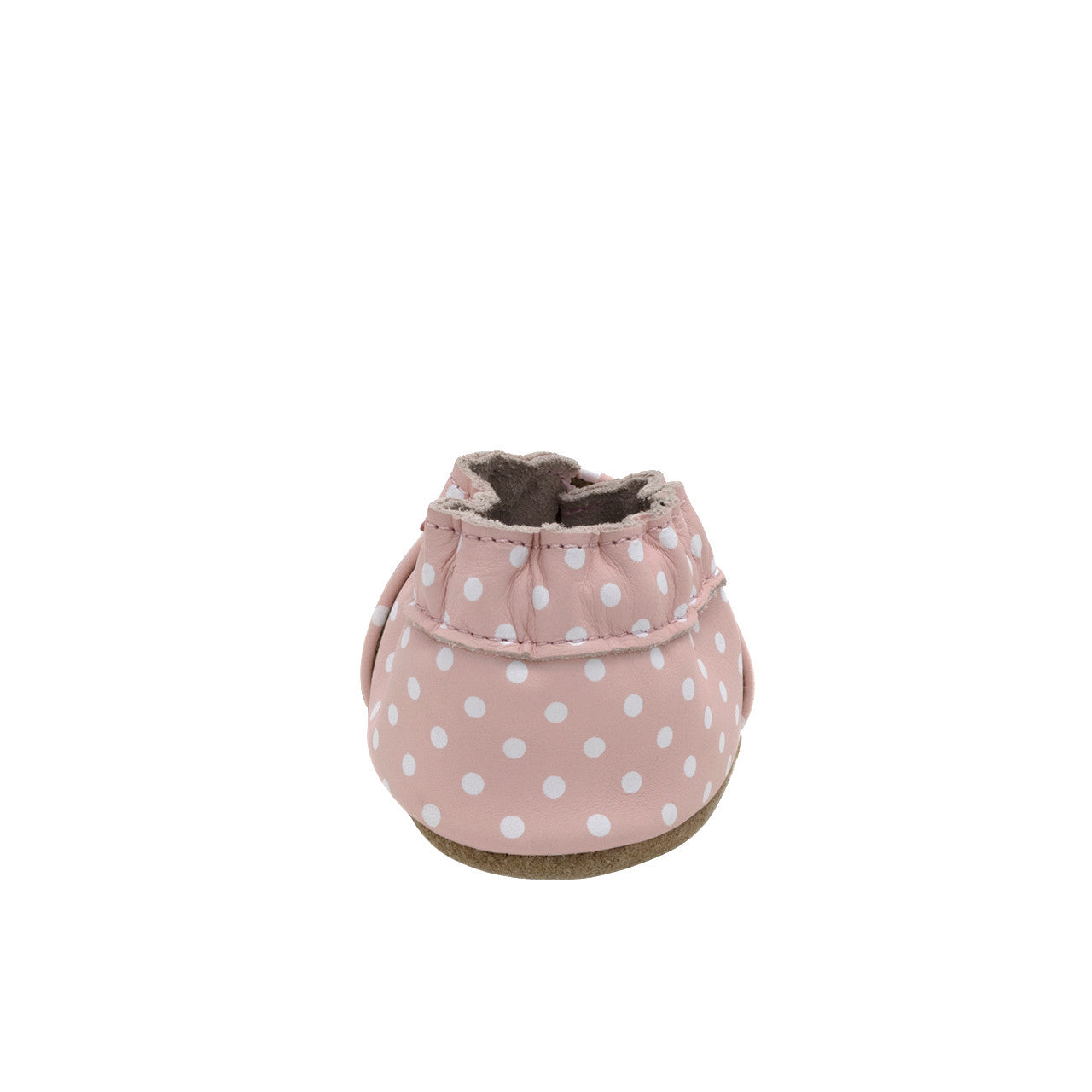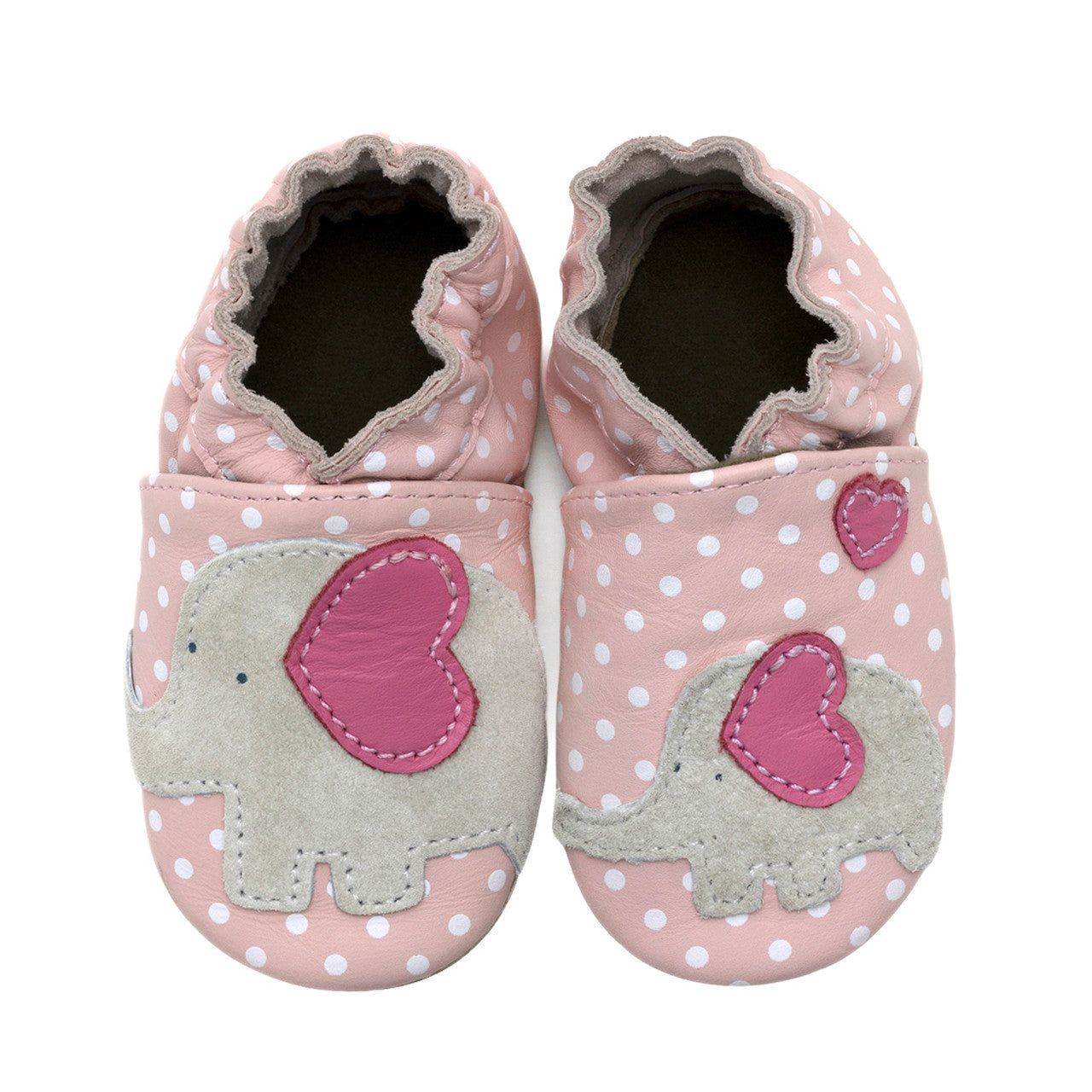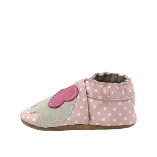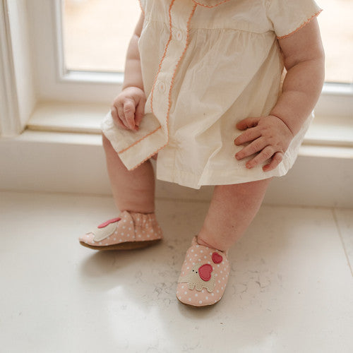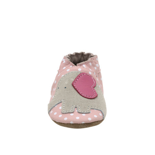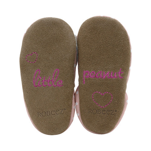 The Robeez Little Peanut Soft Soles are pink baby shoes with a white polka-dot leather upper with a soft, suede sole and inner lining. These pink toddler shoes feature a mother and baby elephant on each foot playing a game of “Follow The Leader” and are sure to become a favorite in your toddler’s closet. Adorable details of these shoes include leather appliquéd ears shaped like hearts and "Little Peanut" embroidered on the sole in pink thread.