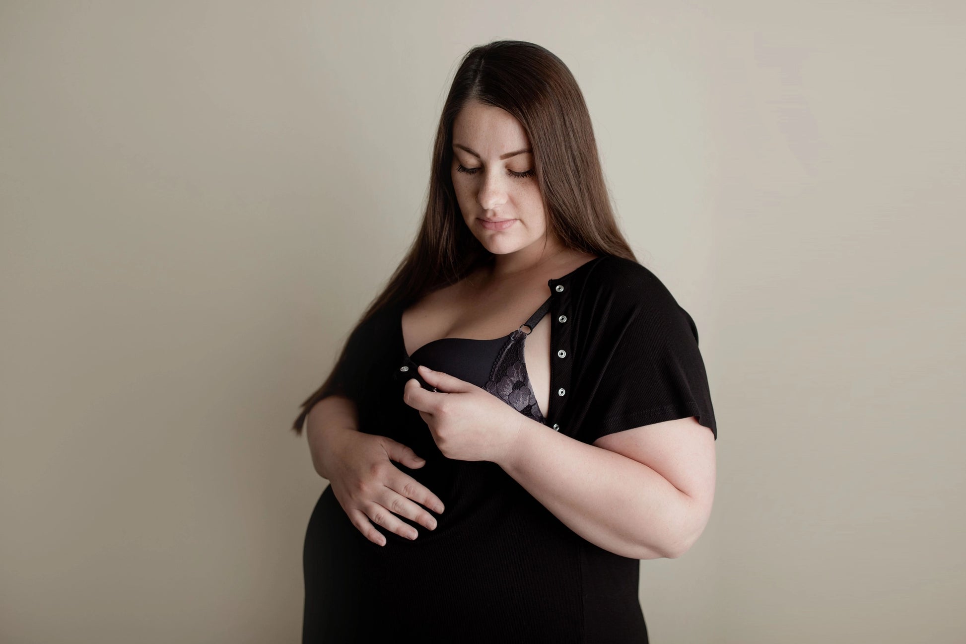 The buttery soft fabric stretches as a comfortable nightgown option for your growing belly at every stage. The easy-to-use snaps on the shoulder make it easy to breastfeed in the middle of the night. Honestly, you might never wear anything else as they are just that comfy!