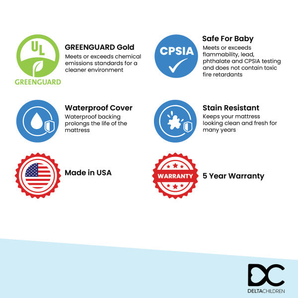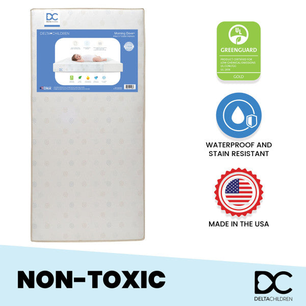 The Morning Dove Dual Sided Crib and Toddler Mattress by Delta Children helps deliver a safer, heathier and better night’s sleep for your newborn, infant or toddler. Its firm and comfortable core is made from over 300 recycled water bottles, making it the best choice for your baby, and the environment. The waterproof and hypoallergenic cover keeps the mattress clean and cozy for many years. Simply flip the mattress when it comes time for your baby to move from the crib to a toddler bed—it’s specifically designed to fit any standard full-size crib and toddler bed.