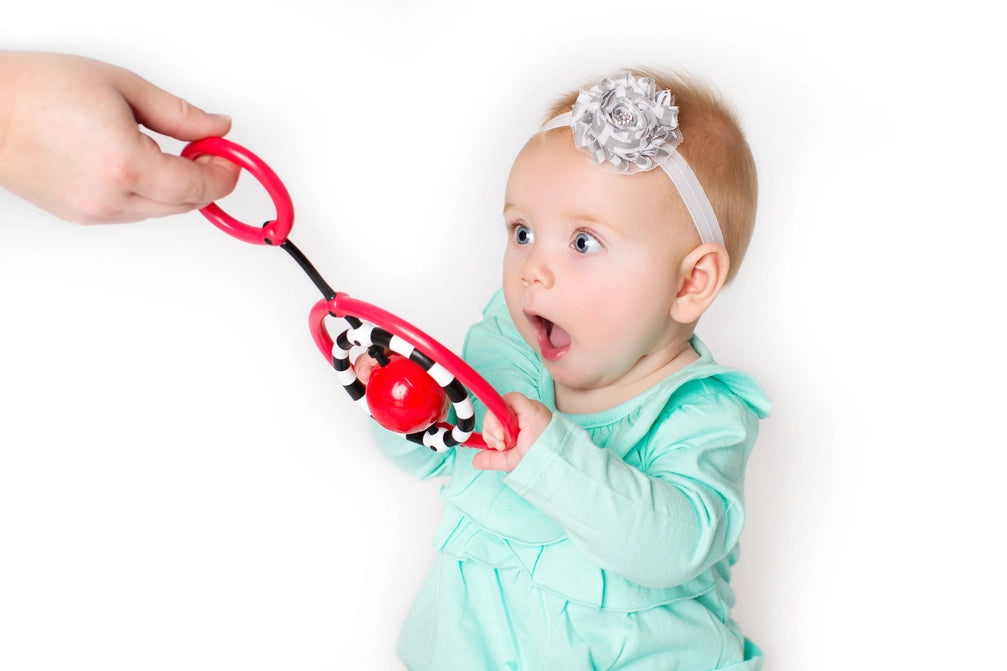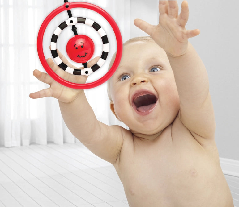 The award winning NogginRings™ Reaching & Grasping Rings help encourage baby's developmental milestones beginning day one. The small ring is for parents to hold during playtime to encourage social play and interaction. The Flexible rings encourage batting, reaching and grasping skills. The high contrast colors promote visual tracking and attention. The soft rattle sound encourages turning to a sound. A parent guide to baby's milestones is included to help guide you through activities and interactions that encourage healthy brain development and bonding. (Ages 0+).