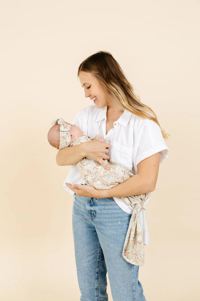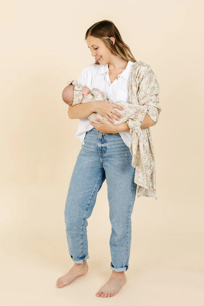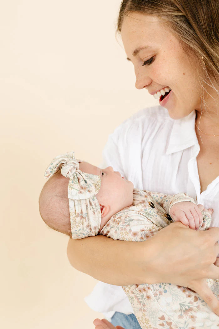 The easiest tie-bottom outfit for day or night. Made for hassle free diaper changes and gentle dressing, I designed this with a button-down front and tie bottom for simple closure (no more snaps at 2am!). Fold over wrist cuffs are the most thoughtful finishing touch.