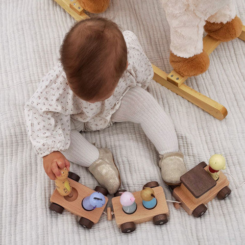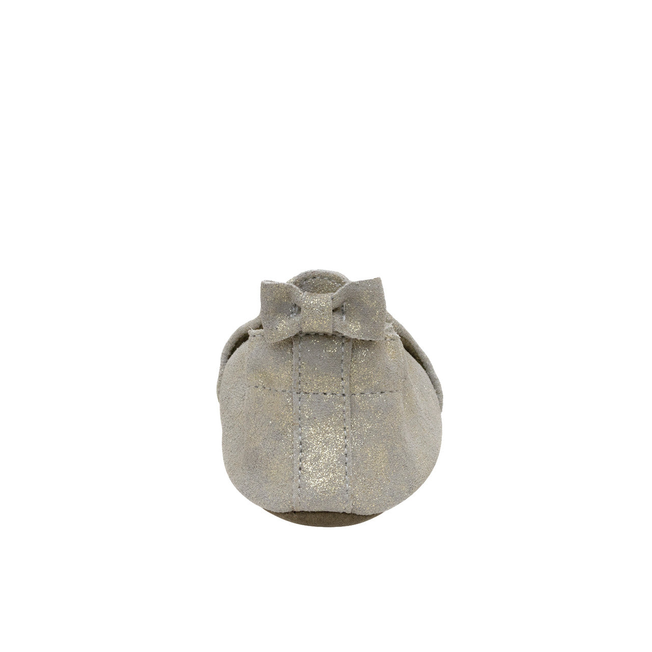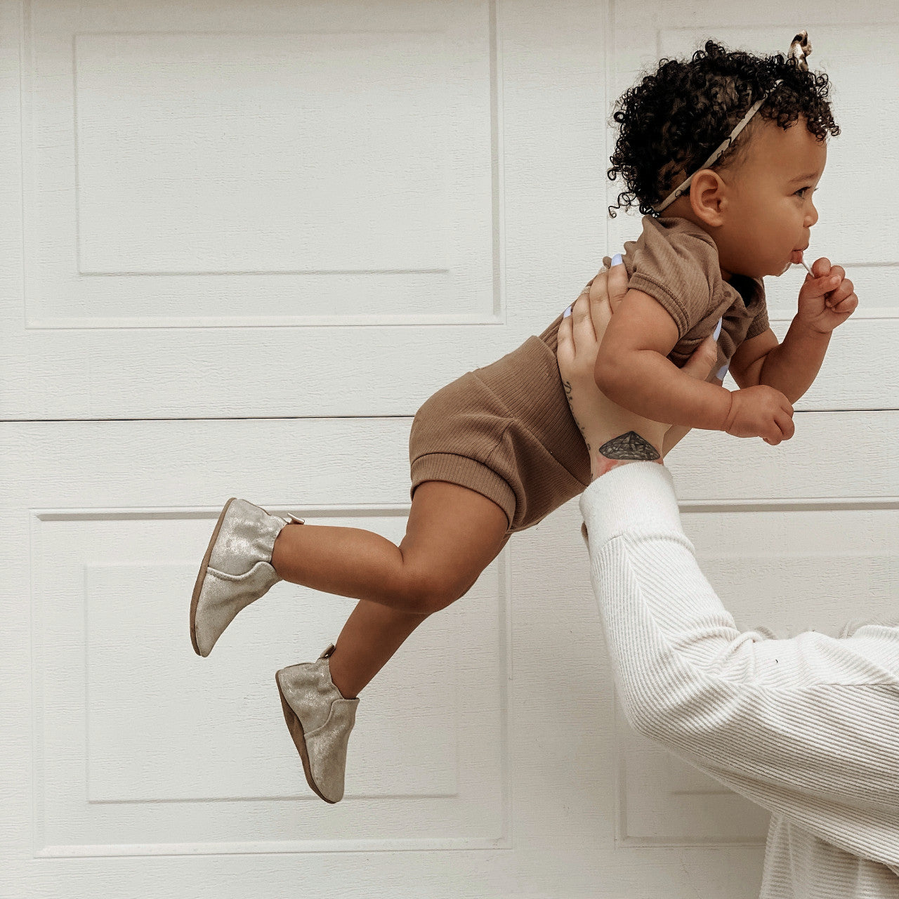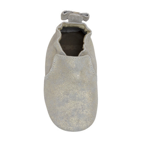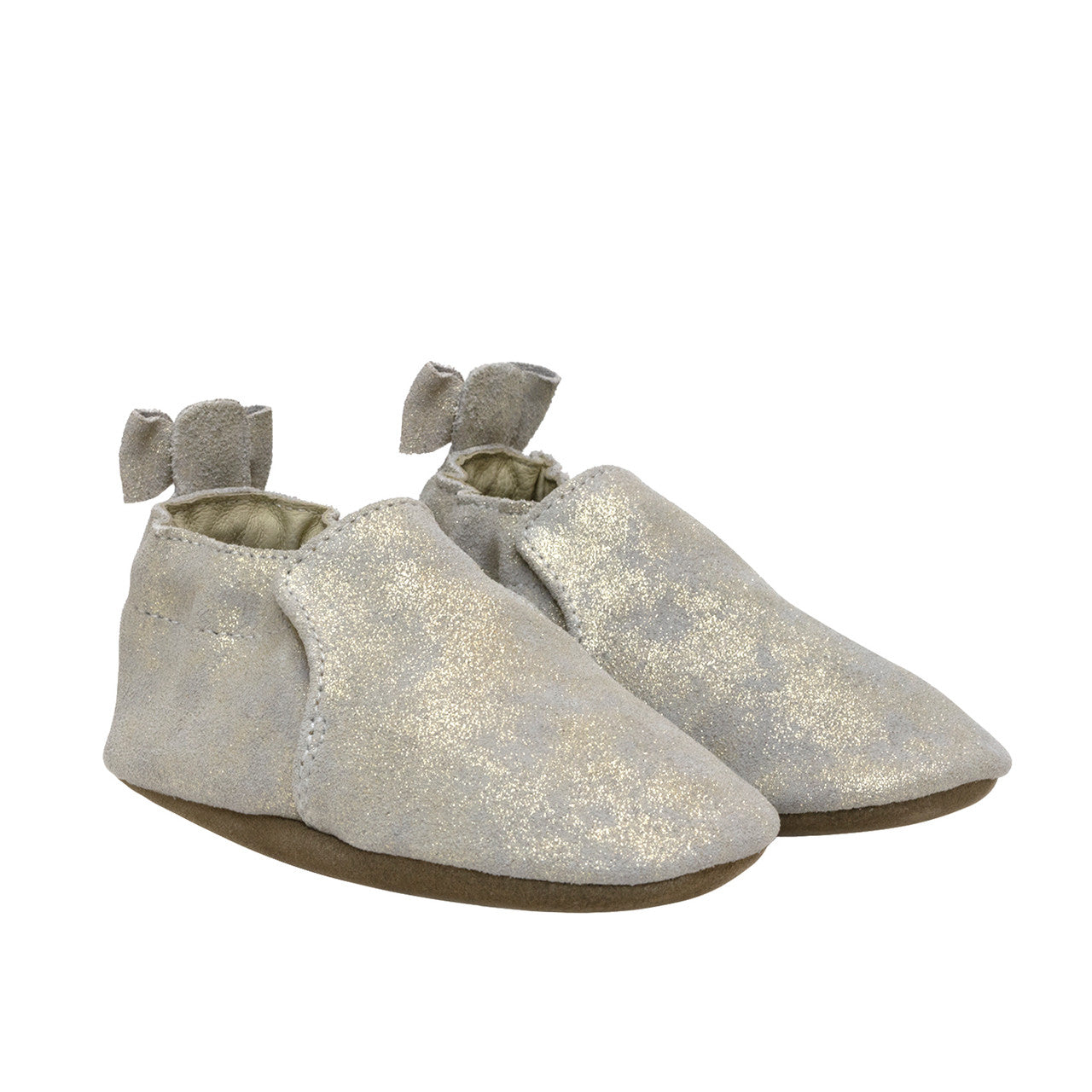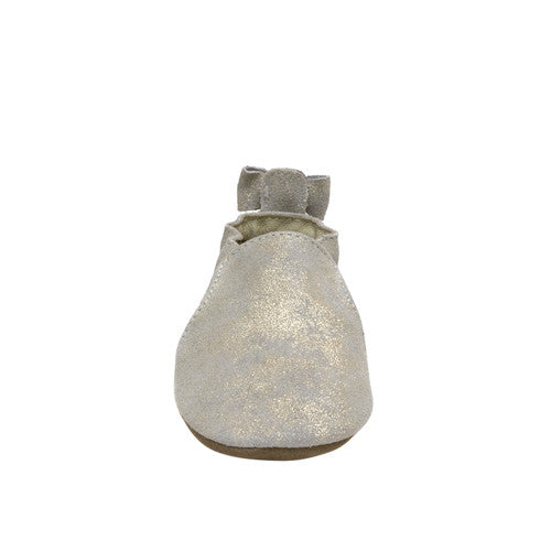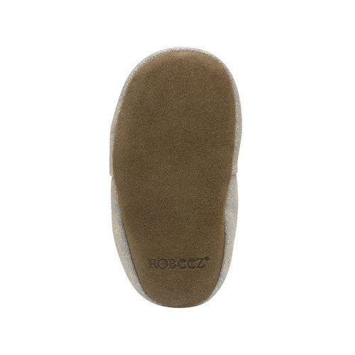 Robeez Pretty Pearl Soft Soles in Gold are comfortable baby slip-ons made with a premium suede upper in sparkly gold and a neutral brown suede on the sole. A shiny, metallic gold leather strip runs up and down the heel with a matching stand-up bow. A roomy fit and flexible material allow your baby's feet to flex naturally and grow up strong. These soft bottom baby girl shoes are carefully designed with the best materials and craftsmanship for your baby’s health, comfort, and safety.