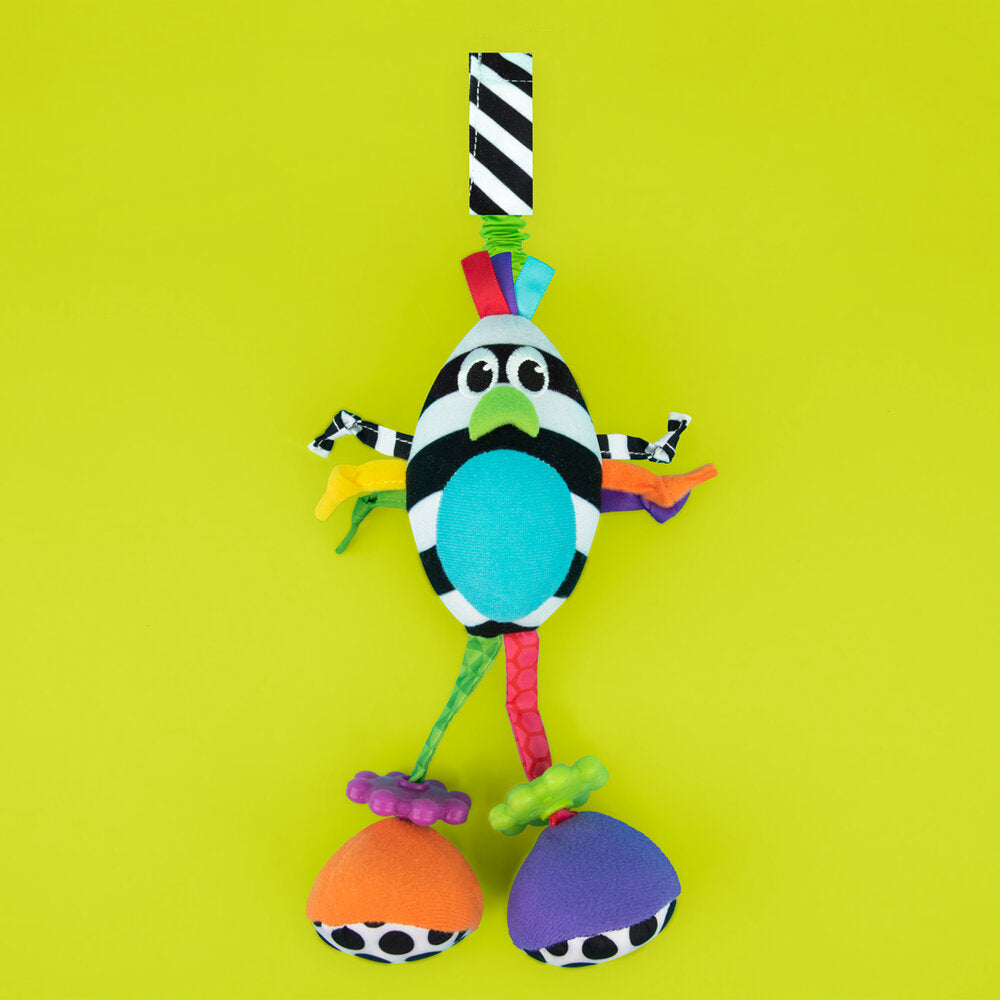 The symmetrical face and body of this birdie has a calming effect on babies. The bright colors and bold patterns of the birdie are visually appropriate for baby’s developing vision and the gentle chime sound teaches baby about cause & effect. The colorful knotties encourage baby’s exploration, and provide a textural element to further develop tactile sensitivity. A repositionable strap allows for on-the-go fun! Also available in Black & White Boppin' Birdie!