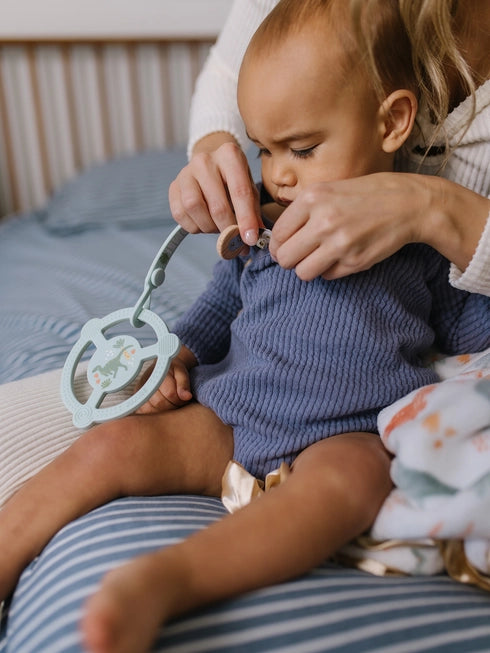Help soothe your baby’s sore gums with the Silicone Teether Ring with Detachable Clip from JuJuBe x Studio Oh! This teether features an easy-to-grip design and three different massaging textures so Baby can choose what feels best. Place it in the freezer before use for additional cooling relief.
