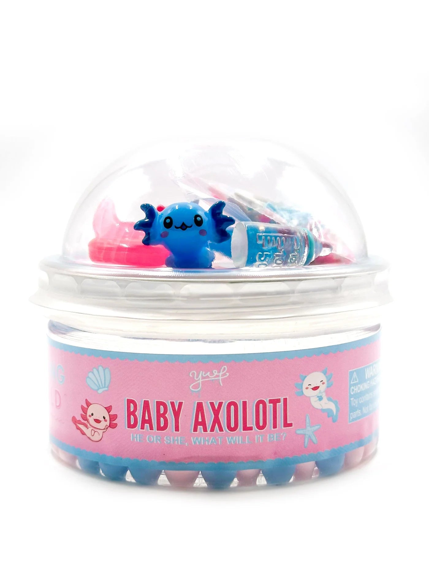 Our customer favorite axolotl slime is a clear slime with the yummiest blueberry scent! If you don't know what an axolotl is, ask any kiddo, they are all the rage!! It comes with everything you need to take care of your baby axolotls.