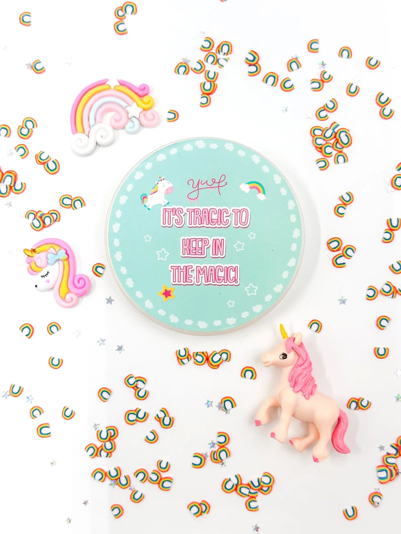 Our Unicorn in the Clouds slime is a glittery pink gel slime that comes with two unicorns, a rainbow, and a colorful sprinkle mix in a small baggie. It has a light watermelon scent.