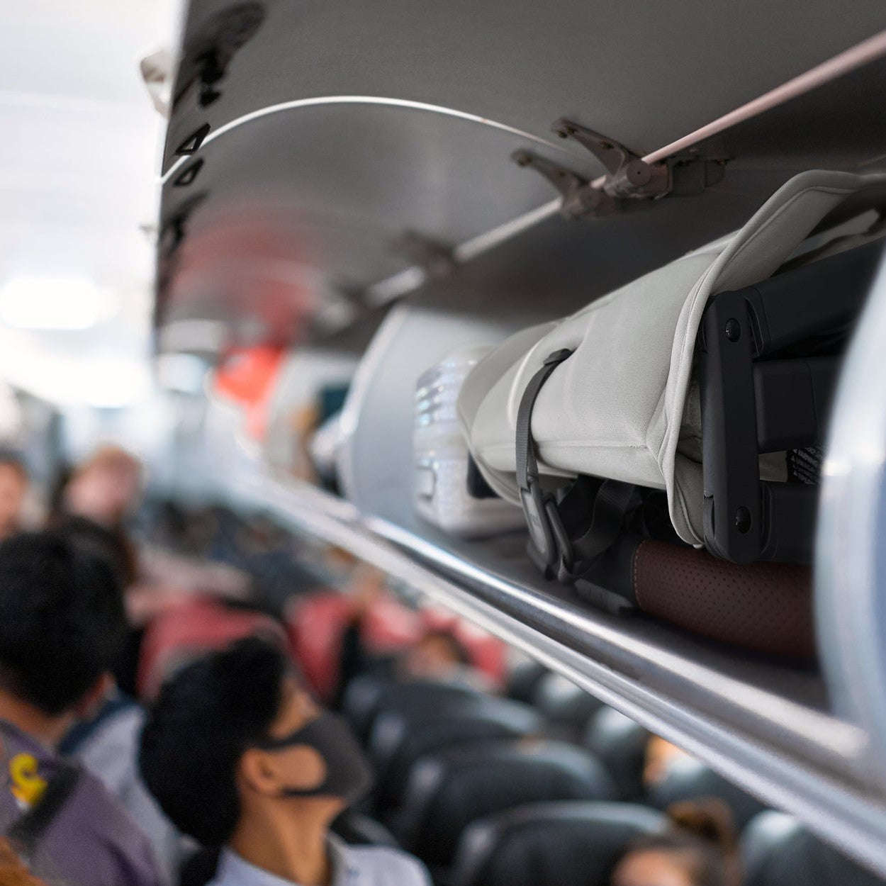 - The slim design fits into an overhead compartment with IATA-compatible dimensions