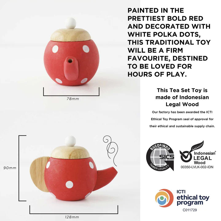 With 3 cups and saucers, a teapot, a tea bag a spoon, there's even biscuits to dunk. All presented on a sturdy tray, every piece is carved from sustainable wood.